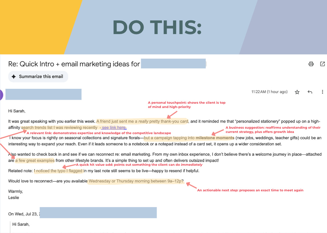 Oh this is GOOD. When I'm on the receiving end of an email like example #2, it is so anxiety-inducing because the onus is entirely on *me.* Everyone just wants you to hold their hand through any big decision, and an email that essentially says "HEY why won't you answer me?" is so off-putting and puts one more thing on my plate to figure out. Love all your ideas for real, authentic, helpful, hand-holding follow-up emails. 🤝